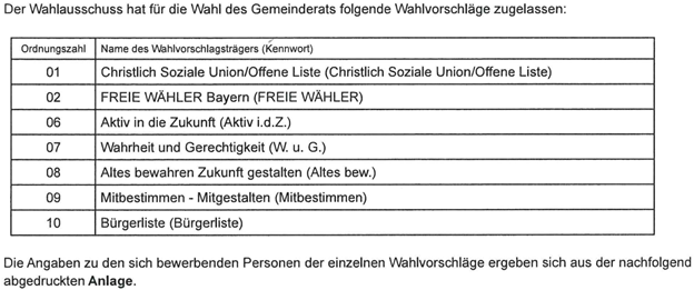 - Zugelassene Wahlvorschläge für die Wahl des Gemeinderats